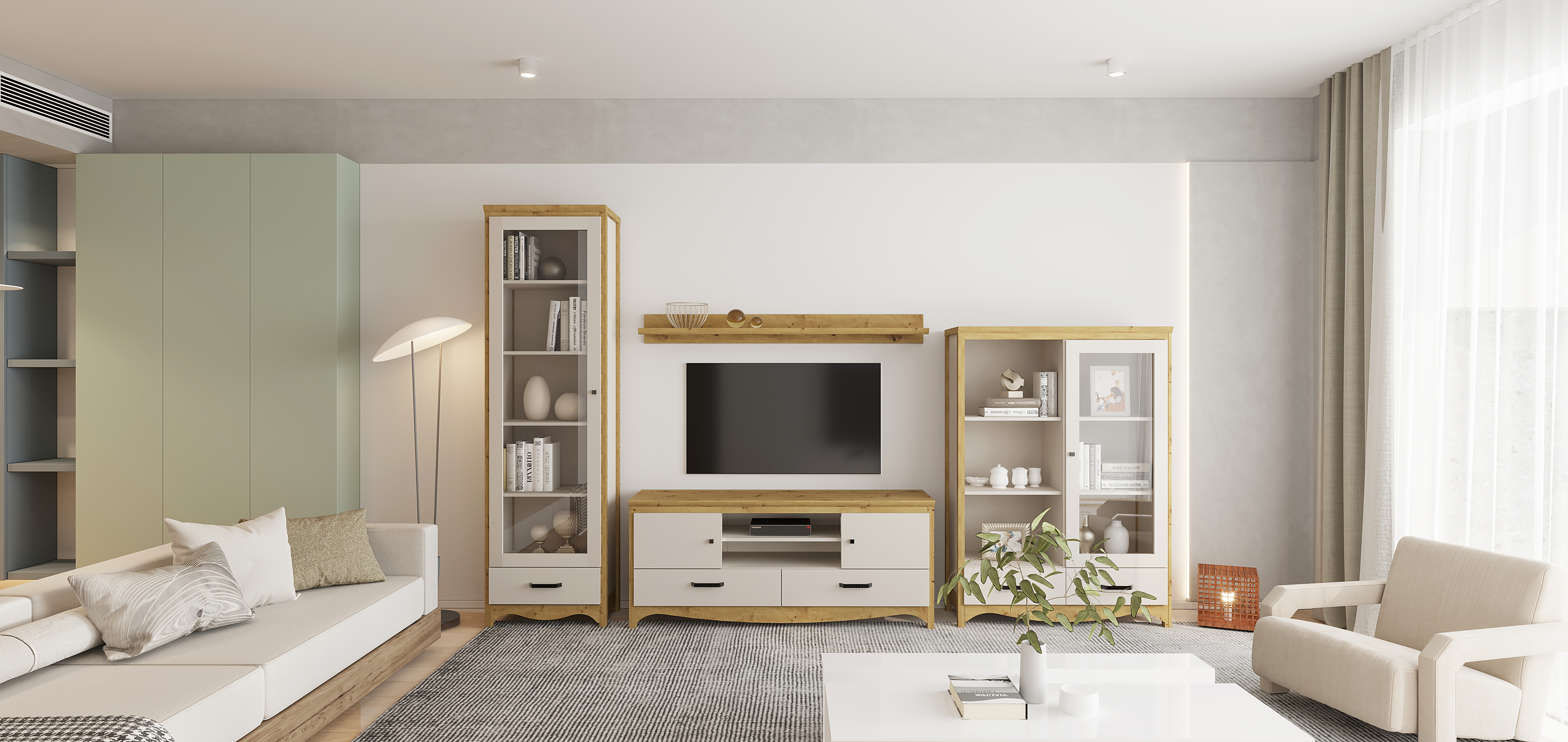 Гостиная Дана Гербор выполнена в цвете кашемир с декоративными вставками дуб артизан. Коллекция объединяет классические формы с современными акцентами, создавая гармоничный баланс функциональности и эстетики.