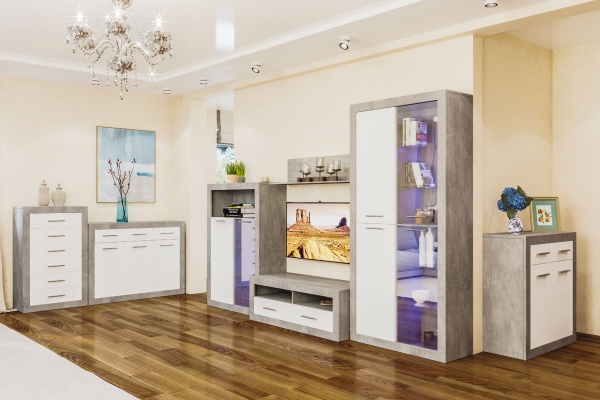 Современная модульная гостиная Омега от украинской мебельной фабрики Світ Меблів выпускается из ЛДСП с фасадами из МДФ в цвете: индастриал/белый, в конструкции выдвижных ящиков используются направляющие полного открывания в витринах есть LED-подсветка.