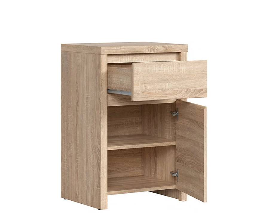Тумба Каспиан KOM1D1SP БРВ — компактное и стильное решение для хранения вещей из популярной коллекции Каспиан от украинского производителя БРВ. Модель выполнена в современном оттенке дуб сонома с выразительной древесной текстурой или дуб сонома/кашемир, благодаря чему гармонично вписывается в любой интерьер. Конструкция включает одну дверцу и выдвижной ящик, что делает ее удобной для размещения как одежды, так и мелких предметов. Прямолинейный дизайн и отсутствие ручек подчеркивают лаконичный характер мебели. Габариты: 49×77×40,5 см — идеальны для небольших помещений.