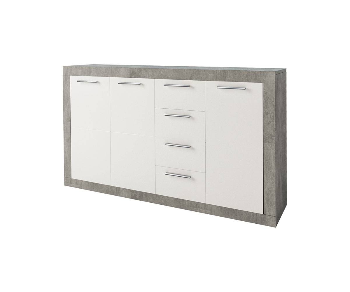 Комод Омега 3Д4Ш от украинской фабрики Світ Меблів имеет по середине 4 выдвижных ящика с направляющими полного открывания и 3 отделения с распашными дверями, внутри полки. Корпус комода производится из ЛДСП, фасады МДФ.