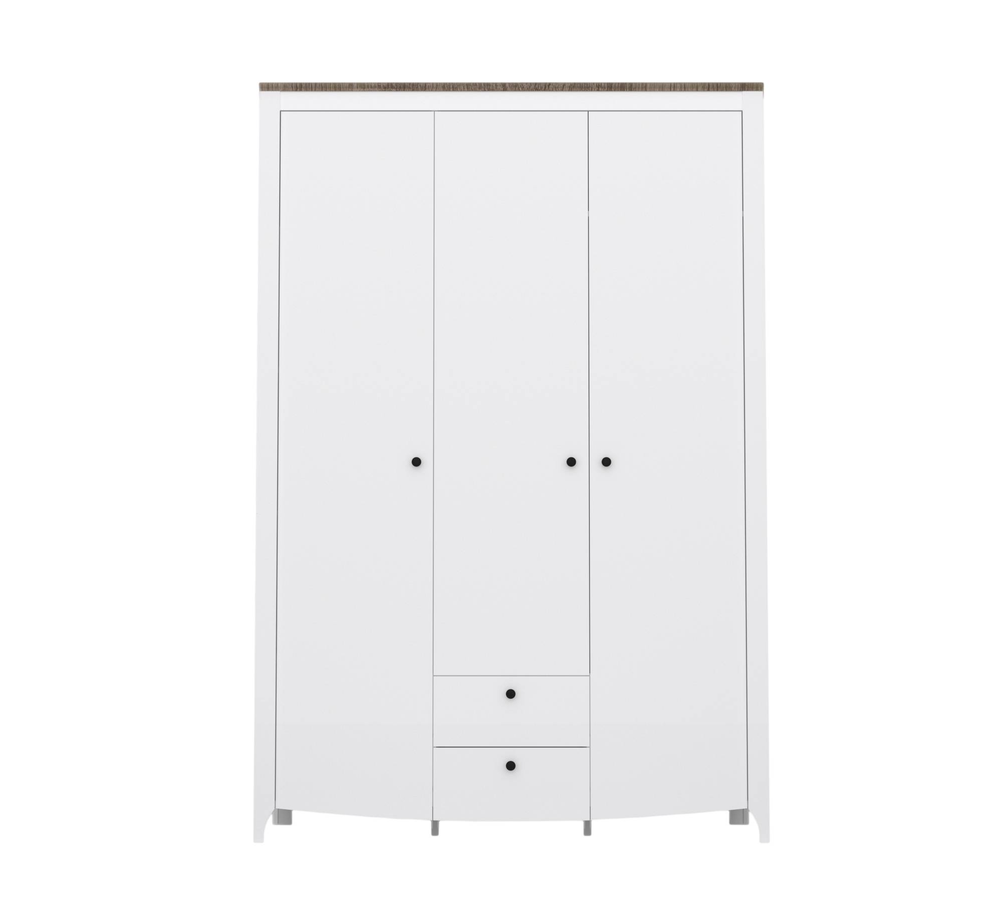 Шкаф Карина SZF3D2S Гербор – вместительный элемент модульной системы Карина от фабрики Гербор-холдинг, выполненный в цветовом сочетании нимфея альба/дуб сонома трюфель. Конструкция рассчитана для хранения одежды и сочетает функциональность с современным дизайном. Корпус изготовлен из ламинированной ДСП толщиной 16 мм, крышка усилена плитой 22 мм. Слева расположено отделение с четырьмя полками, удобными для хранения сложенных вещей. За центральной и правой дверью установлена полка и штанга для размещения одежды на вешалках. В нижней части шкафа предусмотрены две выдвижные ящика на шариковых направляющих полного выдвижения HAFELE, обеспечивающих плавную и надёжную работу. Дверцы оснащены навесными петлями HETTICH, что гарантирует долговечность конструкции.