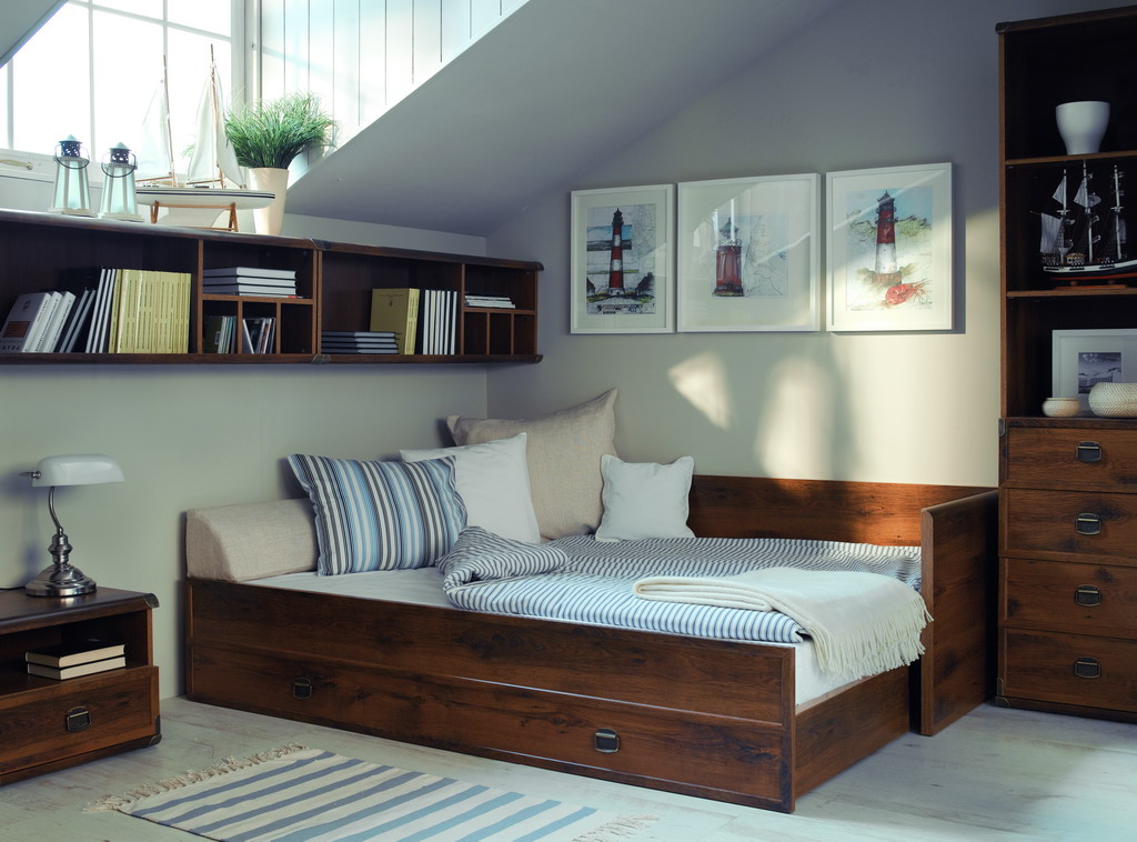 Состоит спальня Индиана из пяти элементов, призванных обеспечить обитателю комнаты максимальный комфорт. Высокий стеллаж, прикроватная тумба и две навесные полки способны вместить большое количество вещей, а раздвижная кровать — превратить отдых в настоящее удовольствие.