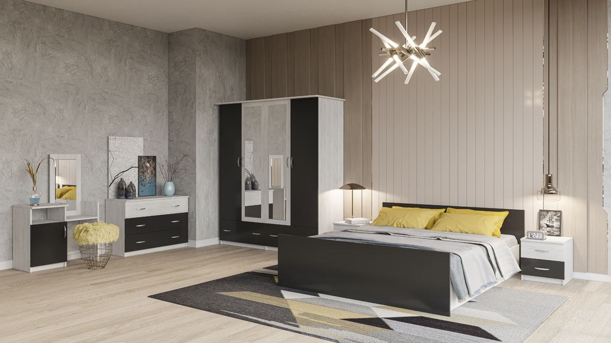 Современная спальня Соня от мебельной фабрики Світ Меблів. Большая двуспальной кровать с размером спального места 160 х 200 см, вместительный комод и большой шкаф - поможет сделать ваше пространство для отдыха функциональным и уютным. Спальня Соня выпускается в цвете антрацит / артвуд светлый.
