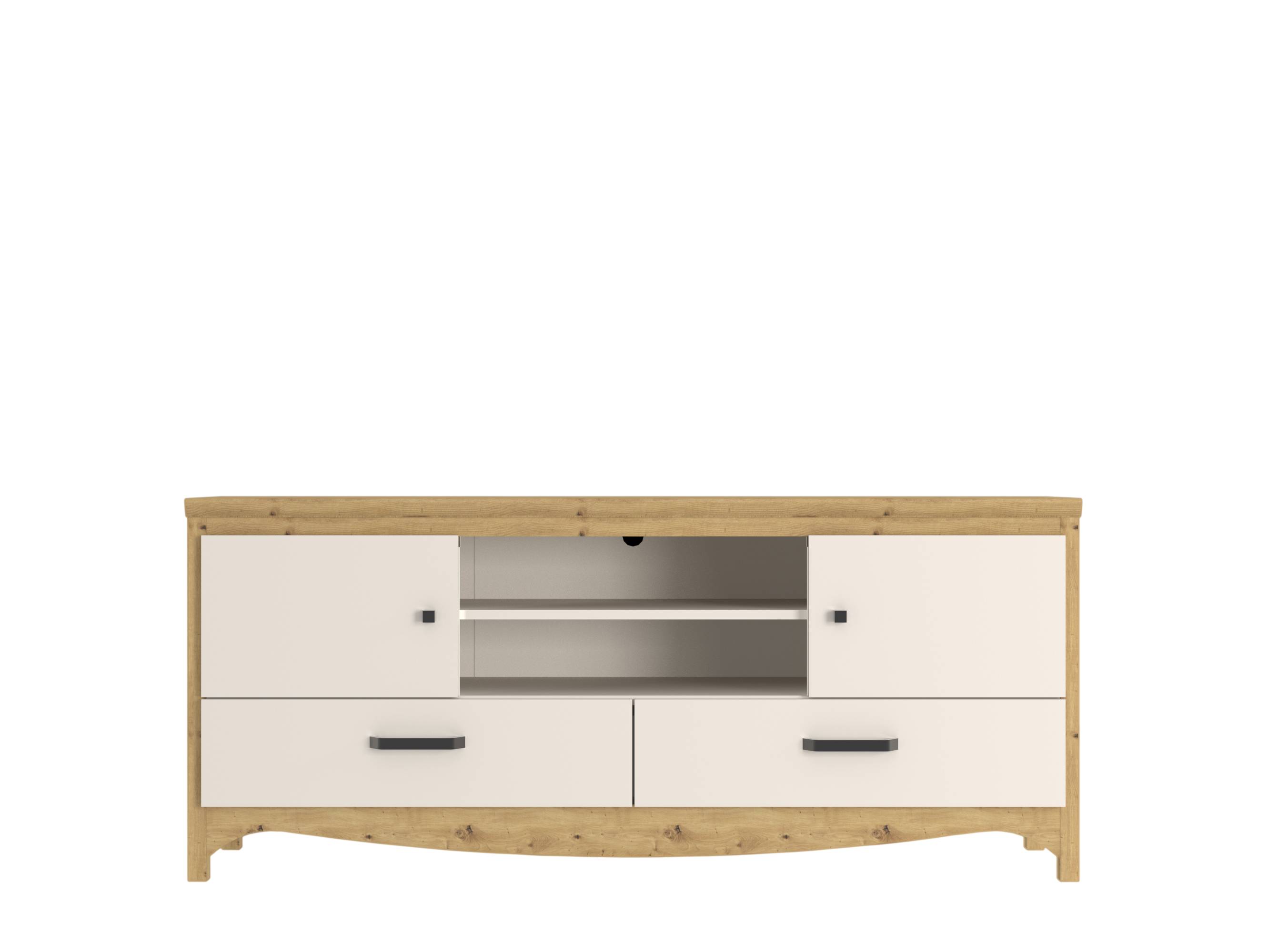 Тумба ТВ Дана RTV2D2S Гербор выполнена в цвете кашемир с вставками дуб артизан. Конструкция сочетает практичность и современный дизайн: два выдвижных ящика и две распашные двери обеспечивают удобное хранение вещей, а открытая ниша с полкой подходит для размещения техники или аксессуаров. Продуманная организация пространства делает тумбу функциональным элементом интерьера, который гармонично вписывается в гостиную и дополняет коллекцию мебели Дана.