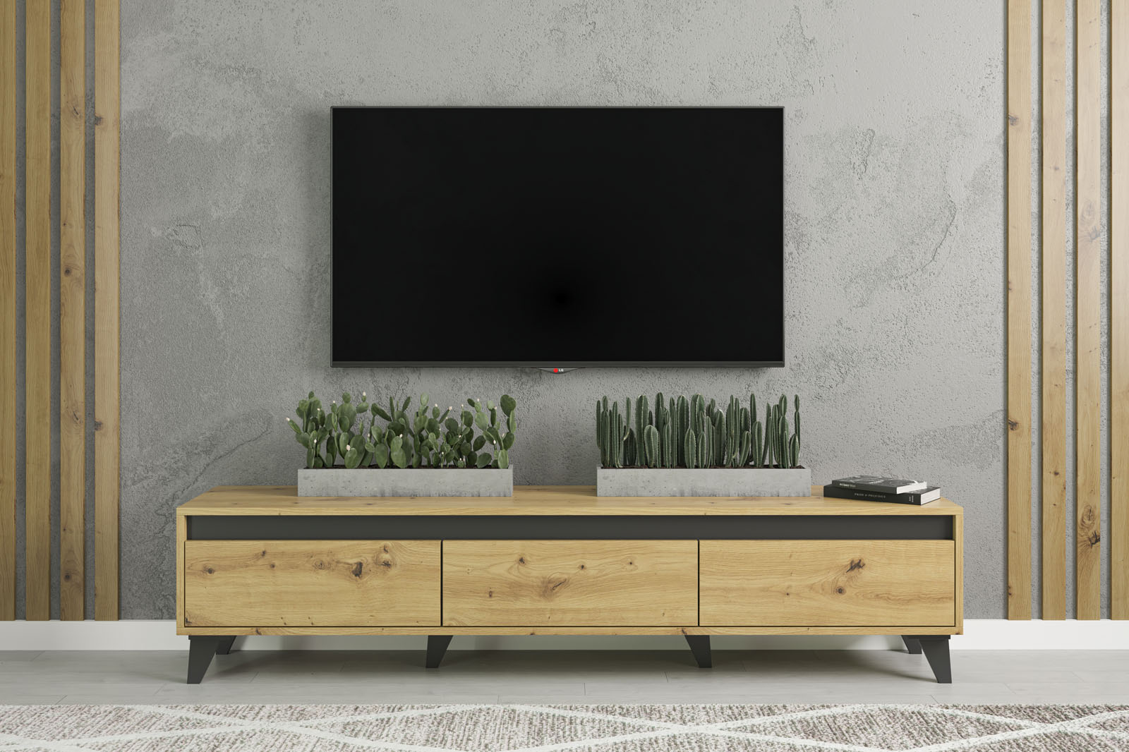 Тумба ТВ Одри от украинского производителя Світ Меблів в цвете дуб артизан , со вставками и ножками в цвете антрацит. Имеет три выдвижных ящика с направляющими полного выдвижения.