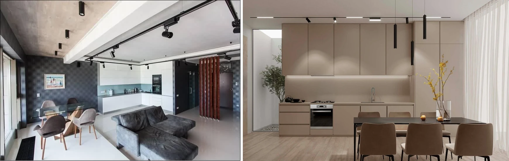 - Подвесной монтаж используется в помещениях с высокими потолками или для создания визуального зонирования. Шина опускается на тросах или жестких штангах. В квартирах встречается редко, в основном это решение для лофтов, студий, коммерческих пространств.